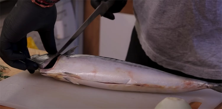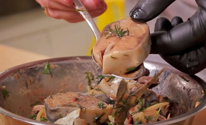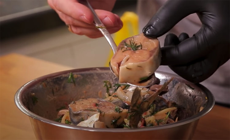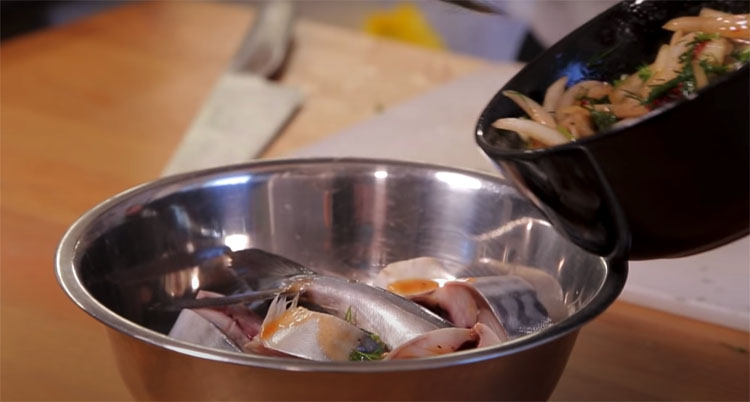 Теперь добавляем маринад к предварительно порезанной на кусочки скумбрии. Саму рыбу сначала очищаем от центральной кости и внутренностей.