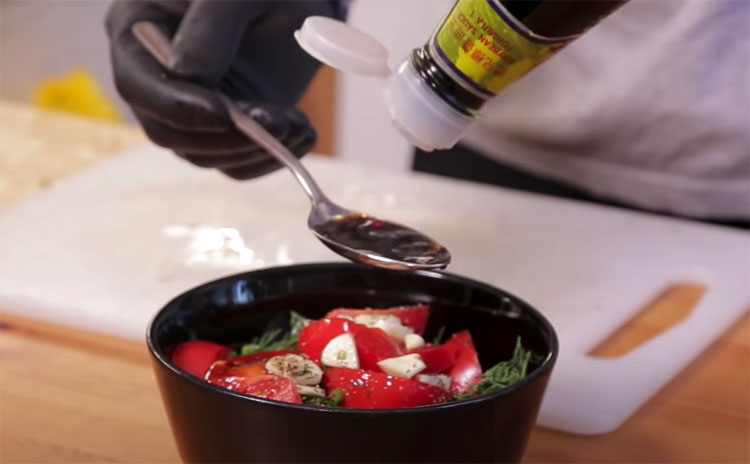 Сначала делаем маринад. Основа состоит из помидоров, лука, зелени и специй. Добавляем и немного соевого соуса.