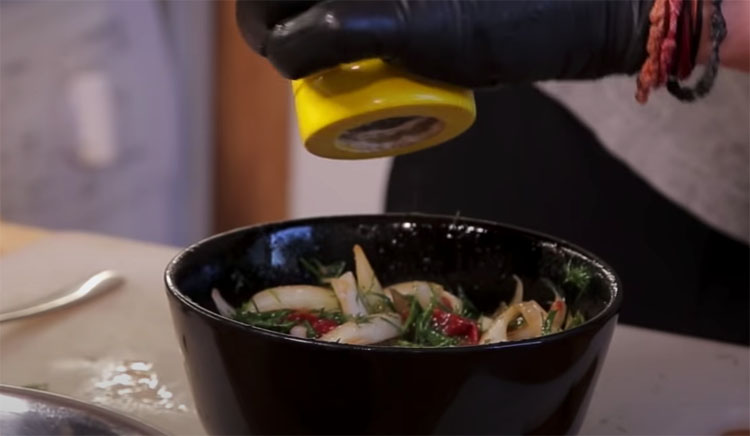 Обильно солим. Маринад должен быть крепче обычного салата, ведь он должен дать вкус нашей скумбрии.