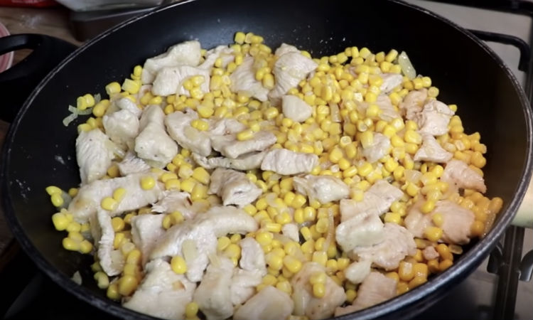 Первым сделаем рецепт с индейкой — филе понадобится примерно 400 граммов. Кукурузы возьмем 300 граммов, добавим столовую ложку муки, половину репчатого лука, 1/2 стакана воды, белый перец, соль и оливковое масло. Обжариваем на сковороде порезанную мелко индейку и лук, добавляем воду, солим и перчим. В последнюю очередь засыпаем кукурузу и доводим до готовности под крышкой.
