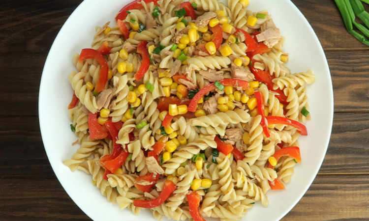Третий рецепт идеально подойдет к ужину. Берем 400 граммов коротких макарон, луковицу, 300 граммов консервированной кукурузы и 160 граммов консервированного натурального тунца. Можно по желанию добавить и острого зеленого перца.